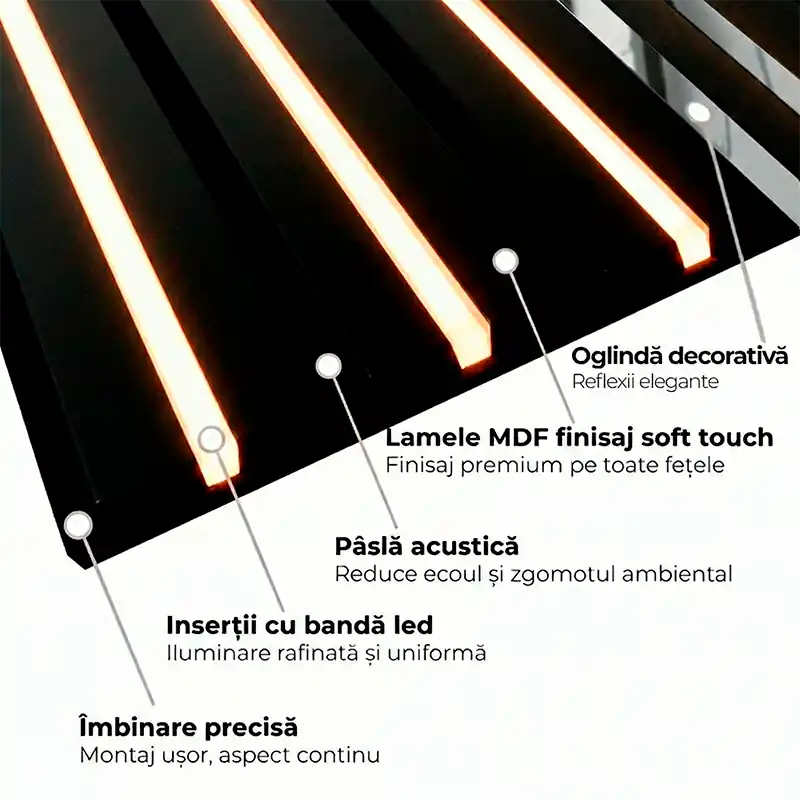Design 3-în-1: textura lamelelor MDF, lumină ambientală caldă prin cele 3 benzi LED și contrastul rafinat al celor 3 inserții de oglindă argintie.