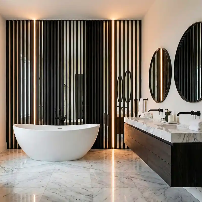 Folosește acest model pentru a crea un perete accent modern, în spatele televizorului sau în zone de recepție. Contrastul dintre negrul mat și oglinda argintie, evidențiat de iluminarea LED, oferă imediat un look elegant și contemporan.