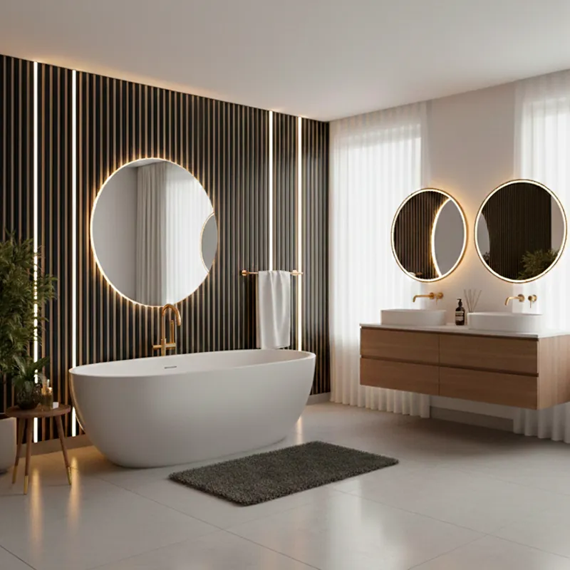 Design 3-în-1: textura modernă a lamelelor MDF, lumină ambientală caldă prin cele 3 benzi LED și contrastul elegant al celor 3 inserții de oglindă aurie.