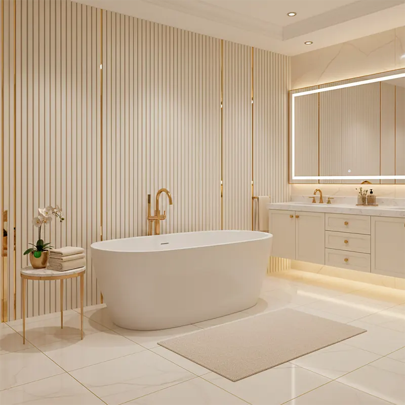 Transformă-ți peretele într-o piesă de artă contemporană. Riflajul premium crem cu inserții de oglindă aurie oferă un echilibru perfect între luxul vizual și confortul ambiental, eliminând discret ecoul pentru o atmosferă relaxantă. Designul de 280 cm asigură o verticalitate impecabilă, punând accent pe reflexiile metalice prețioase și finisajele de înaltă calitate.